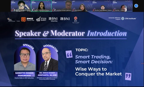 Rangkaian acara dilanjutkan dengan seminar bertajuk “Smart Trading, Smart Decision” yang dimoderatori oleh Bapak Doddy Ariefianto. Seminar ini menghadirkan Sandityo Romen Pamungkas, seorang Equity Sales sekaligus trader aktif dari BNI Sekuritas, sebagai pembicara utama.