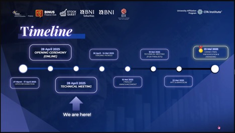 Pada tanggal 28 April 2025, Finance Program BINUS University bersama Binus Finance Club (BNFC) sukses menyelenggarakan Opening Event untuk kompetisi Stockquest 2025. Acara ini menjadi titik awal bagi para peserta untuk memulai perjalanan mereka dalam dunia trading dan equity research yang kompetitif.