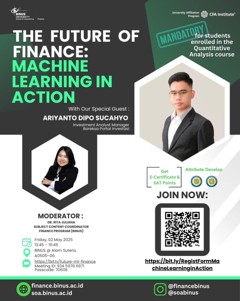 Pada Jumat, 2 Mei 2025, Finance Program BINUS University sukses menyelenggarakan seminar bertajuk “The Future of Finance: Machine Learning in Action”. Acara ini menghadirkan Ariyanto Dipo Sucahyo, Investment Analyst Manager dari Bareksa Portal Investasi, sebagai pembicara utama yang membagikan wawasan mengenai penerapan machine learning dalam dunia keuangan.